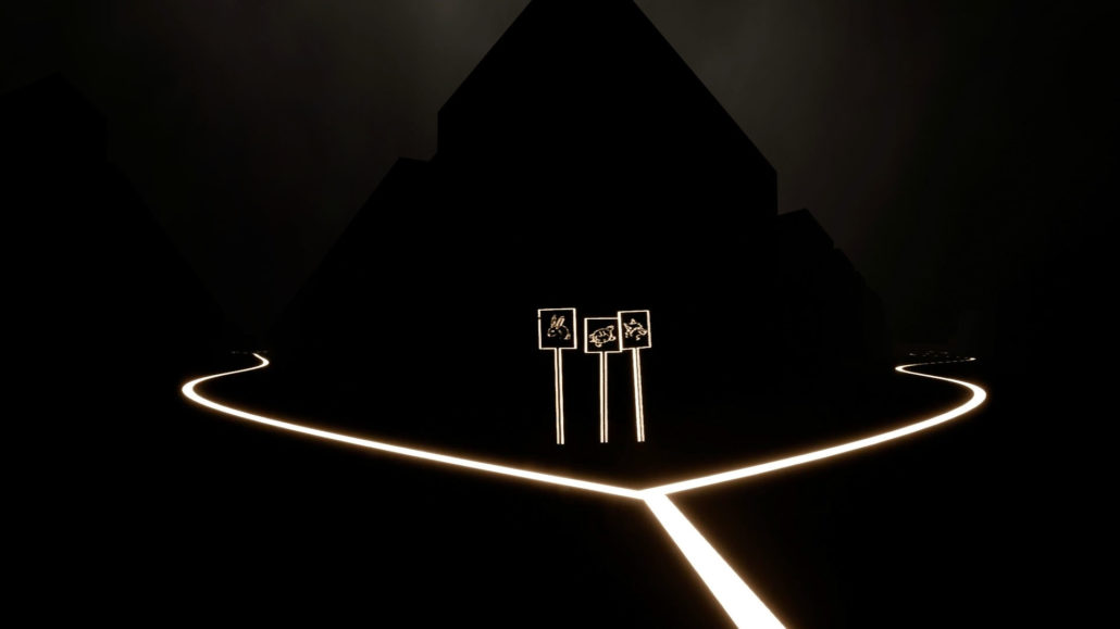 Wisdom (A), each myth’s meaning, is symbolised by a playful light path which gracefully flows betwixt city roads and alleyways. Thought is free to get lost into voices, crossroad choices and surprises hiding in the dark lanes, yet can always find its way back to the path.